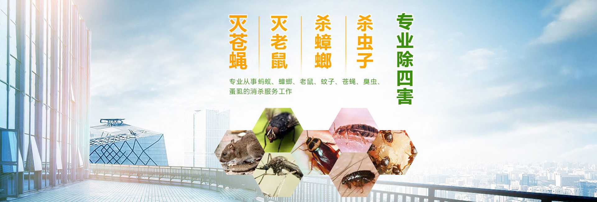 服務(wù)于為賓館飯店、餐飲業(yè)、食品加工業(yè)、建筑業(yè)、商場、超市、學(xué)校、工廠、醫(yī)院等單位和家庭提供鼠蟲害等有害生物防治。